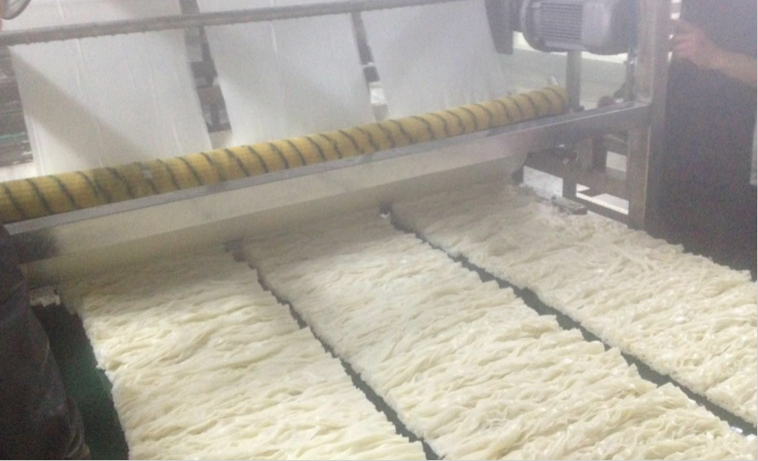 布好漿的網(wǎng)帶自動進入蒸粉機,將米漿蒸熟成米粉片,熟化效果好;