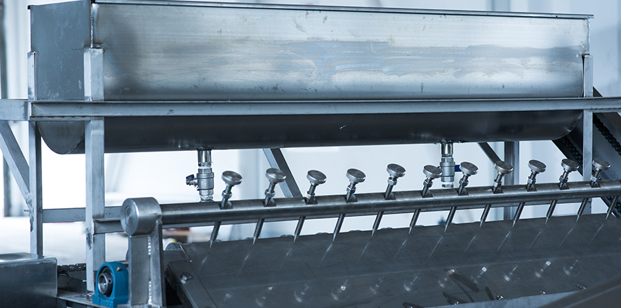 本生產(chǎn)線(xiàn)的調(diào)漿罐裝有攪拌裝置,在定量粉體喂料機(jī)的配合下將米漿調(diào)整到合適的狀態(tài),并防止米漿沉淀。本機(jī)的儲(chǔ)漿罐配有液位計(jì)和攪拌裝置,保證漿液不發(fā)生沉淀,布漿均勻。