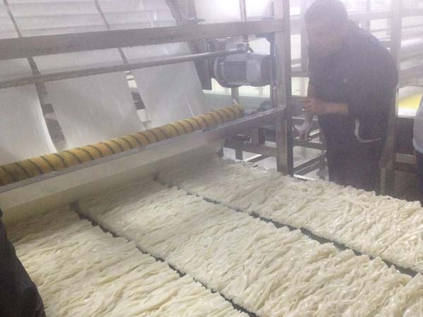洗米 — 除砂 — 泡米 — 磨漿 — 調(diào)漿(加水、淀粉)— 預(yù)熱 — 擠片 — 預(yù)干燥 —上桿切斷 — 低溫老化 — 干燥 — 冷卻